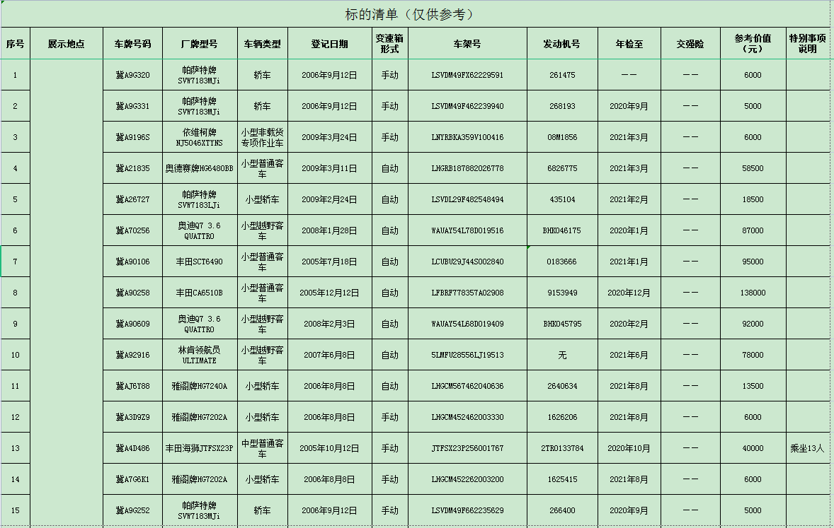受委托,我公司定于2021年5月20日9:00在石家莊市石清路9號河北省公共資源大廈采用中拍協網絡競價平臺(網址:https://paimai.caa123.org.cn/)公開拍賣舊機動車,詳情請登陸我公司網站http://www.26kg.cn查詢。本次拍賣保證金伍萬元(保證金不計利息),競買保證金到賬及報名截止時間為2021年5月18日17:00 。