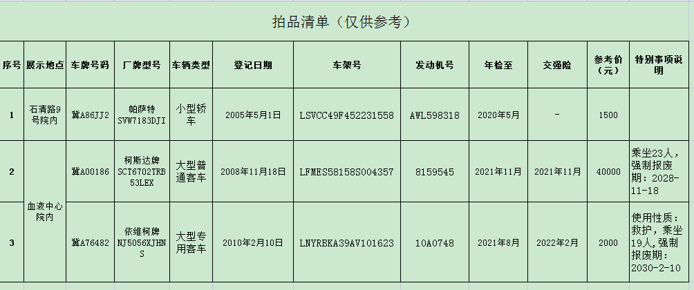 受委托,我公司定于2021年7月15日9:30在石家莊市石清路9號河北省公共資源大廈采用中拍平臺以網絡競價方式公開拍賣舊機動車,詳情請登陸我公司網站http://www.26kg.cn查詢。本次拍賣保證金3萬元(保證金不計利息),競買保證金到賬及報名截止時間為2021年7月13日17:00 。