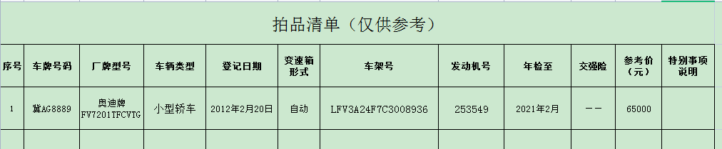 受委托,我公司定于2021年9月16日9:30在石家莊市石清路9號(hào)河北省公共資源大廈采用中拍平臺(tái)以網(wǎng)絡(luò)競(jìng)價(jià)方式公開拍賣舊機(jī)動(dòng)車,詳情請(qǐng)登陸我公司網(wǎng)站http://www.26kg.cn查詢。本次拍賣保證金2萬元(保證金不計(jì)利息),競(jìng)買保證金到賬及報(bào)名截止時(shí)間為2021年9月14日17:00 。